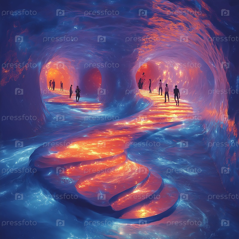 Люди, идущие вдоль светящихся стеклянных столбов у океана на закате