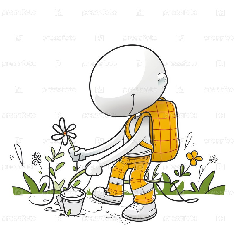 Stickman сажает цветы в сад, изолированный на белом фоне