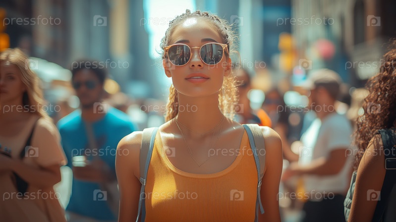 Молодая женщина исследует шумную городскую улицу