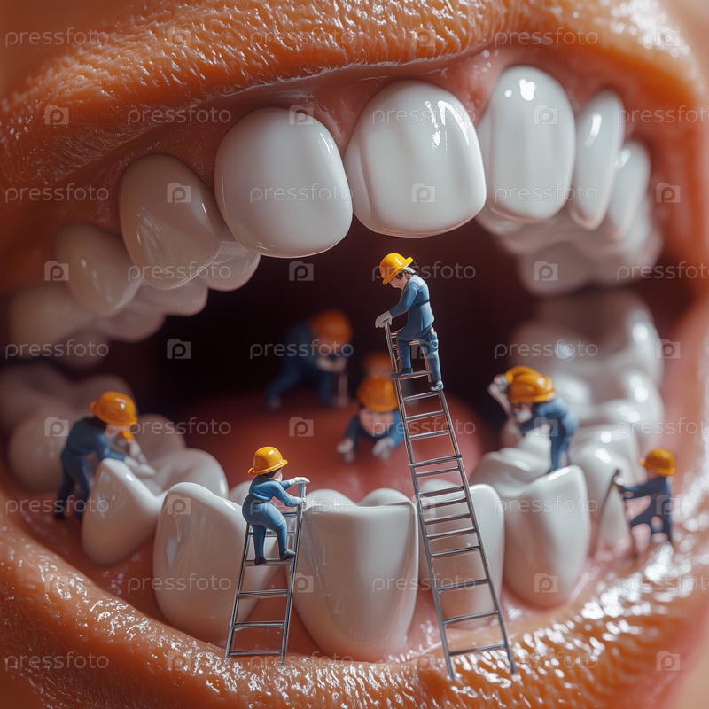Работники миниатюры чистят гигантские зубы в сюрреалистической концепции