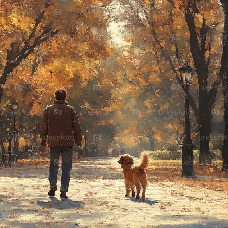 Мужчина гуляет с собакой в солнечном осеннем парке со золотыми листьями