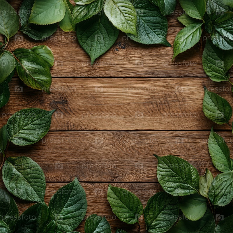Зеленые листья расположены на деревянной поверхности