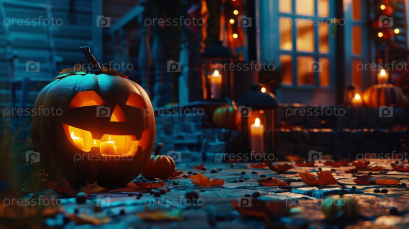 Хэллоуин с людьми в костюмах и тыквенными украшениями