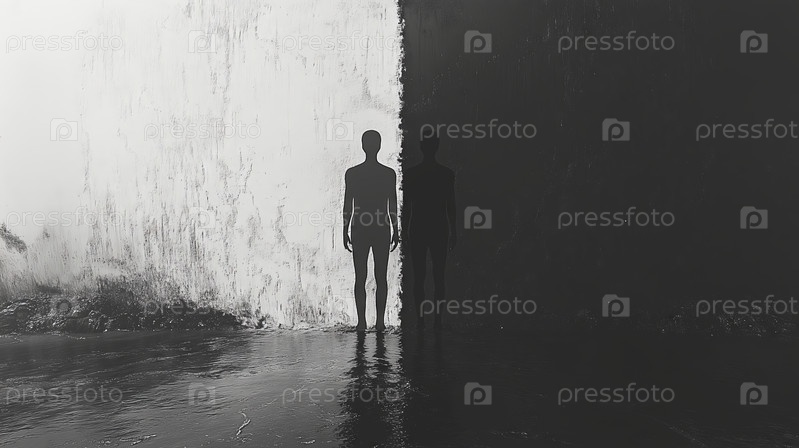 Двойные человеческие фигуры в черно-белом цвете на разделенном фоне