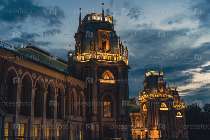 Освещенные готические дворцовые башни под драматическим вечерним небом