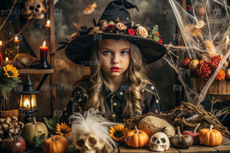 Концепция Хэллоуина. Ужасное. Костюмированная вечеринка. Красивая женщина в костюме ведьмы. Баннер, открытка