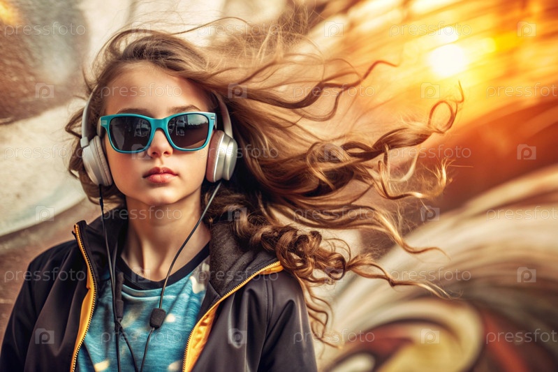 Молодая красивая девушка с большими наушниками и солнцезащитными очками слушает музыку на ушах