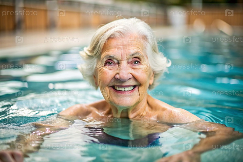 Пожилая женщина плавает и занимается водной аэробикой в отопительном бассейне, счастливый и улыбающийся пенсионер