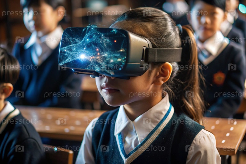 Азиатская девушка с очками виртуальной реальности.Ребенок находится в классе, а другие ученики на заднем плане.Цифровой интерфейс отображается в наушниках