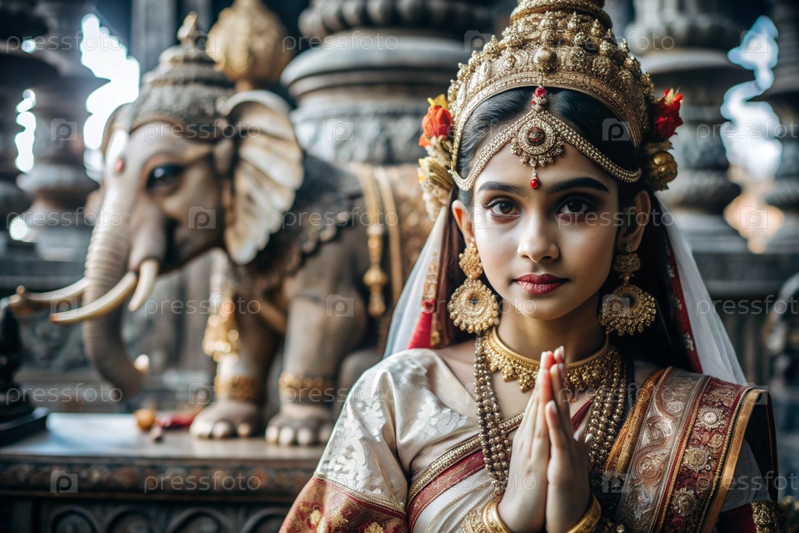 Красивая индийская девушка в традиционном национальном костюме, сари. со слонами. портрет символизирует традиции, культуру и красоту народа Индии