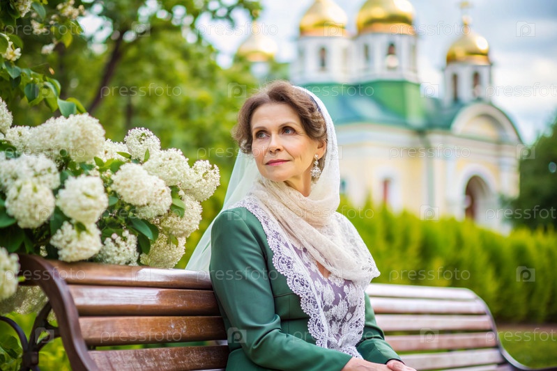 Красивая женщина в плато сидит на скамейке рядом с цветущим деревом перед православной церковью