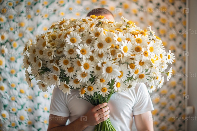 Мужчина с великолепным букетом маргариток мужчины дарят цветы девушкам близко понятие семьи, любви и верности