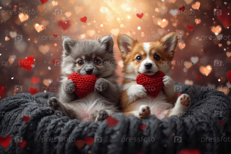 Концепция Дня святого Валентина.Красные плетеные сердца в лапах щенков хаски и шпиц.Почтовая открытка с собаками, лежащими на трикотажном одеяле