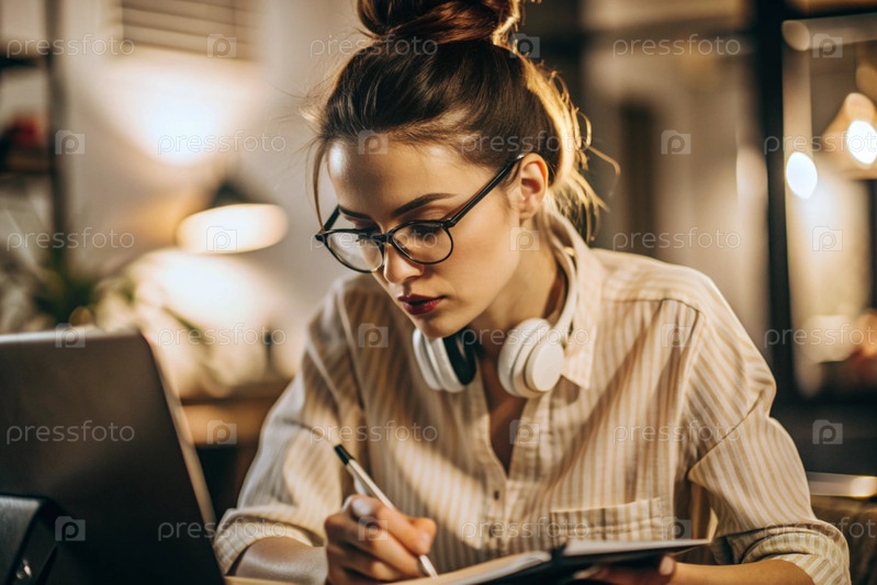 Молодая женщина фрилансер в очках и наушниках работает на ноутбуке или делает покупки в интернет-магазине
