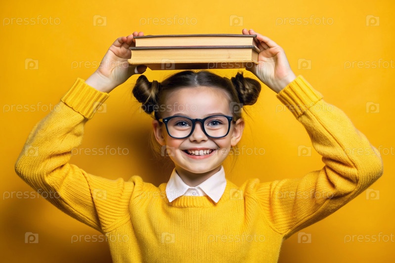 Красивая девушка с очками и книгами на голове. Ребенок впервые ходит в школу. Ребёнок на желтом монохромном фоне. Возвращение к школе