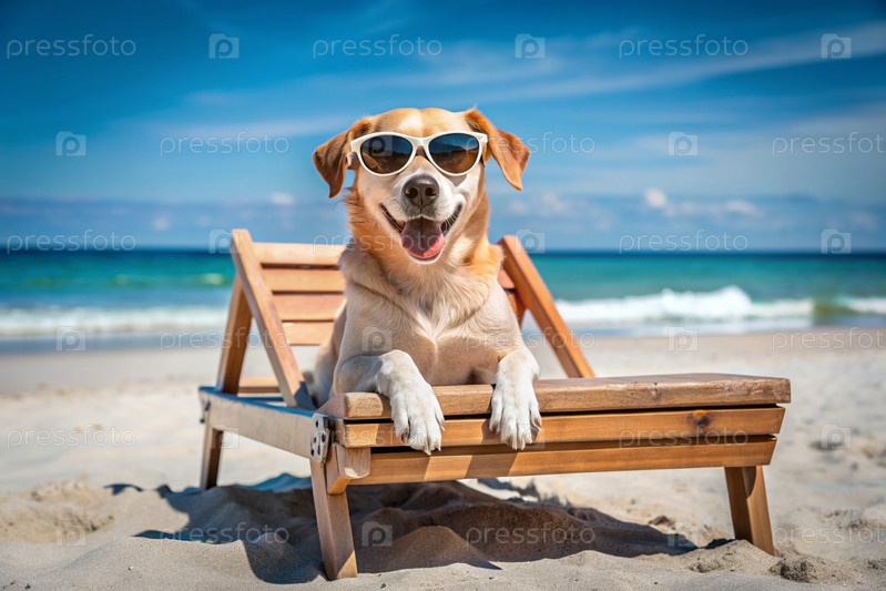 Счастливая собака на пляже в солнцезащитных очках лежит на деревянном шезлонге. концепция курортного отдыха с домашними животными