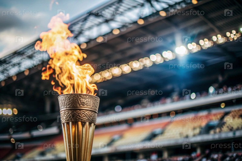 Пламя олимпийского факела горит на фоне спортивного стадиона, арены и красивой размытой стороны