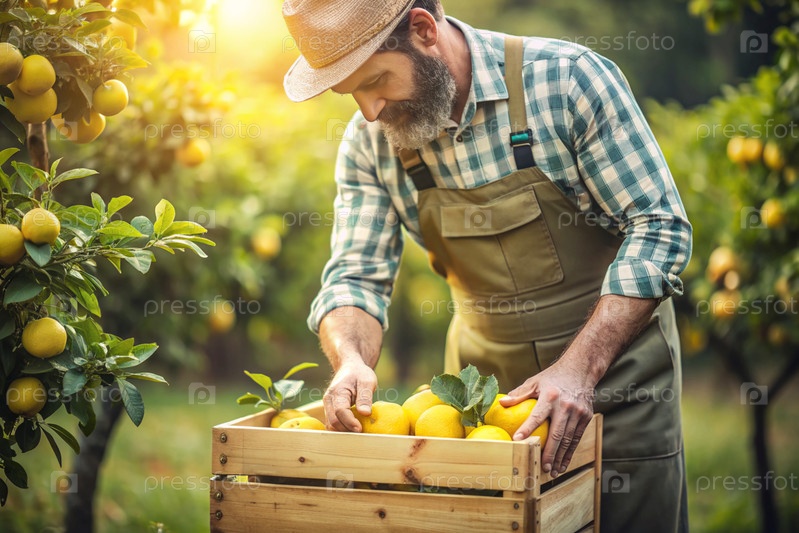 Сельскохозяйственная промышленность. Деревянный ящик с лимонами в руках фермера. Садовник собирает богатый урожай. Ближе, солнечный свет. Осенний плодовый сбор