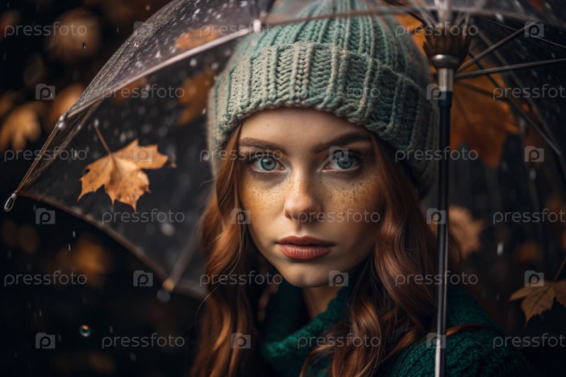 Осенний портрет под дождем. Близкий план молодой рыжеволосой женщины с ярко выраженными зелеными глазами в вязанной шляпе под зонтиком