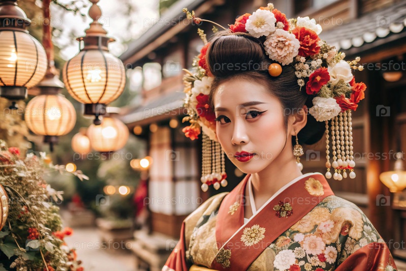 Японская девушка в традиционном национальном костюме - кимоно. На фоне домов, фонарей и вишневых деревьев портрет символизирует традиции и культуру народа Японии