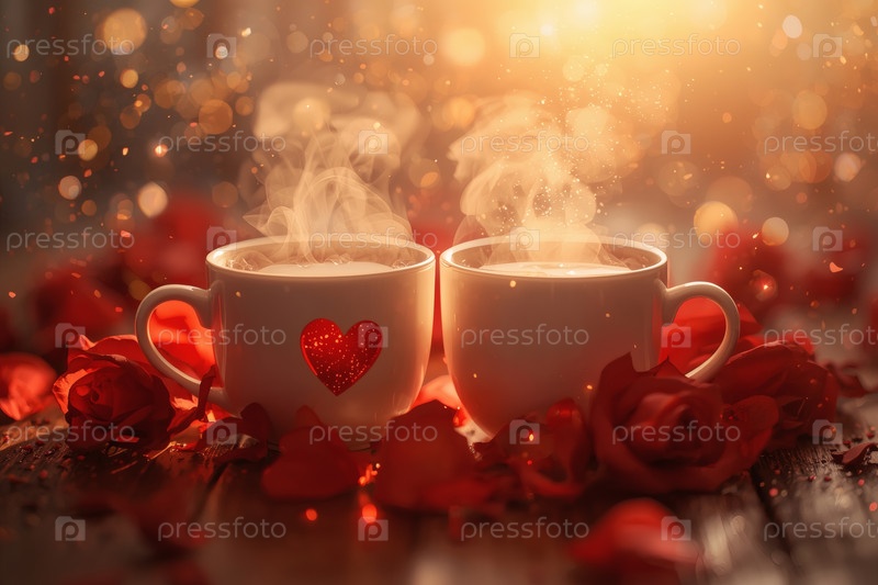 Чашки горячего кофе или чая, окруженные красными цветами и сердцами в День святого Валентина