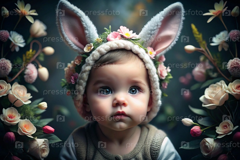 Баннер. Винтажная открытка. Девушка в костюме пасхального кролика с милыми ушами. Концепция праздника Bright Easter Spring