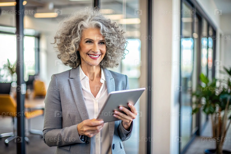 Деловая пожилая женщина с кудрявыми волосами. Она носит простую куртку. В руках таблетки. Бизнесмен смотрит на экран своего смартфона