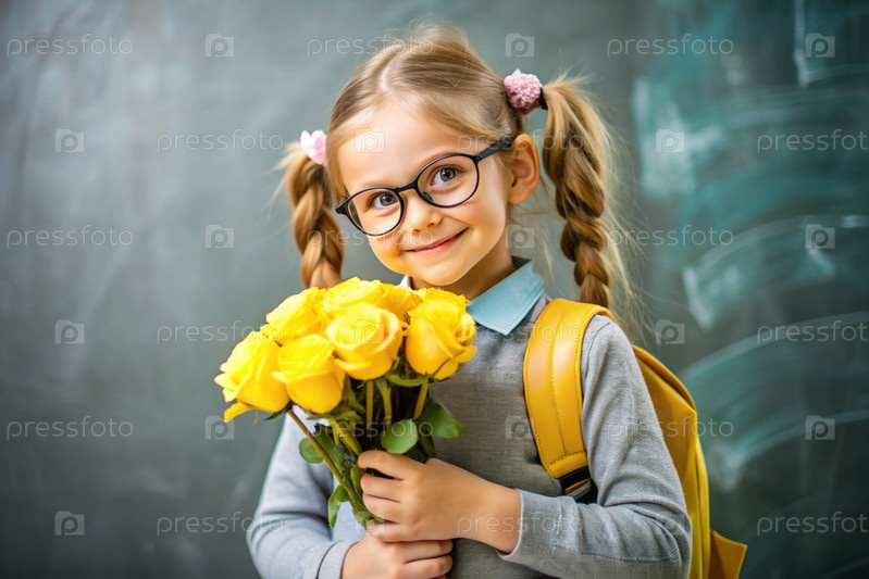 Красивая первоклассница с очками и коньими хвостами на голове. Букет осенних цветов. Ребенок впервые идет в школу. Ребёнок с рюкзаком, книгой и цветами. Возвращение в школу