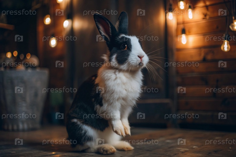 Маленький пушистый бело-черный кролик в качестве домашнего питомца во внутренней части квартиры