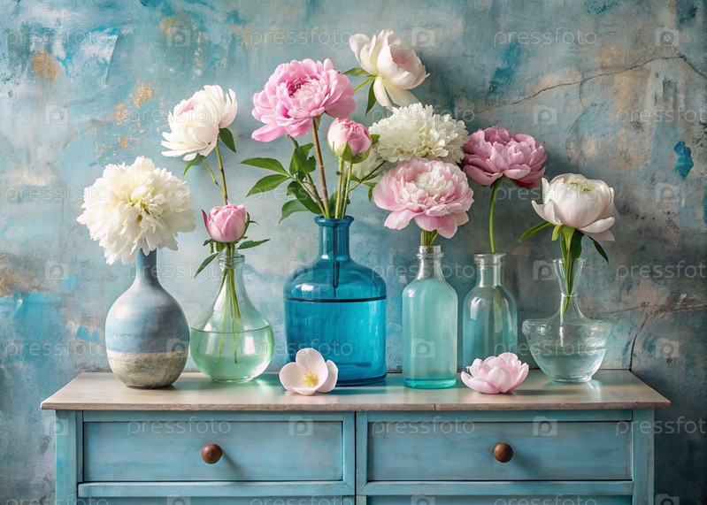 Красивые бело-розовые пионы в стеклянных вазах и бутылки на деревянном шкафчике. Цветы и почки в вазе. Светлый, белый, розовый и синий цветочный фон