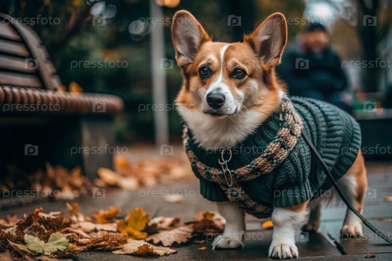 Любимый питомец: милая валлийская собака Корги в вязанном теплом комбинезоне на прогулке по городу