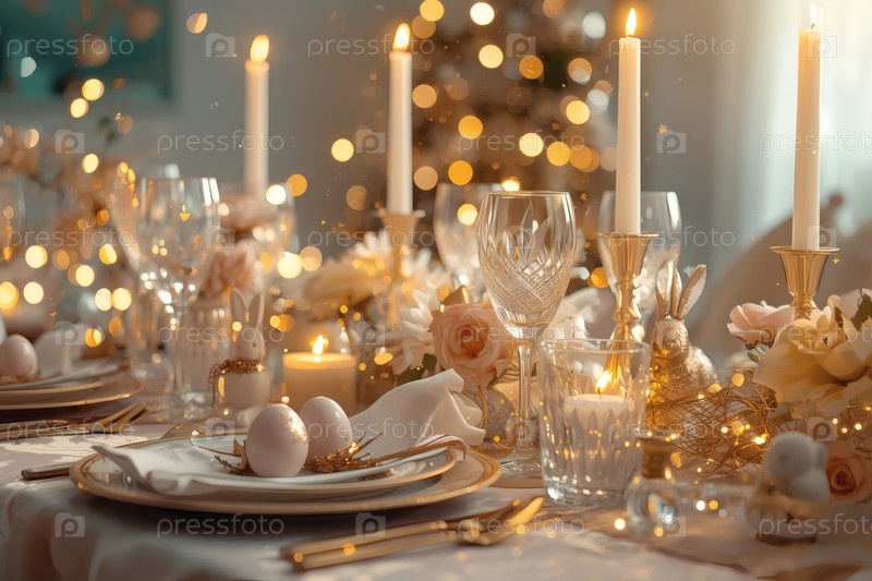 Пасхальный баннер 2026. декоративная тарелка, столовая посуда, стаканы, пасхальные яйца и кролики. концепция празднования Пасхи для кафе и ресторанов
