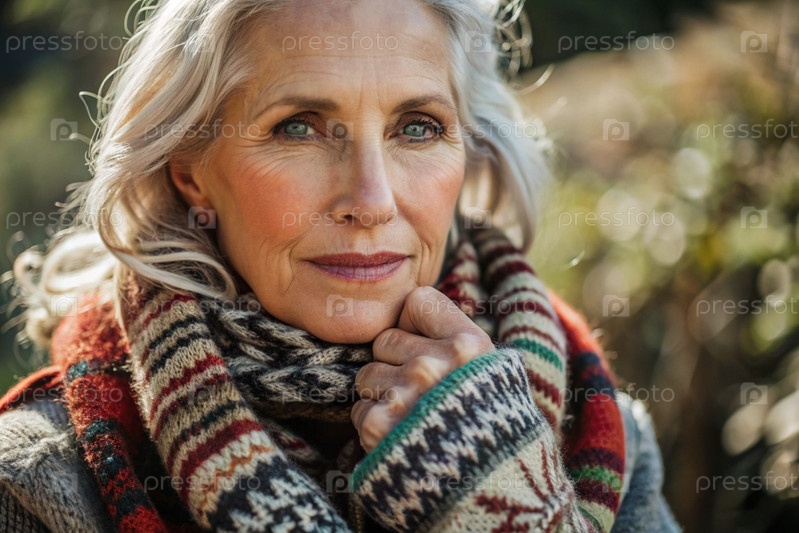 Осенний портрет красивой пожилой женщины, пенсионерки 70 лет. Она носит шарф с этническим узором и теплый свитер. Концепция жизни пожилых людей