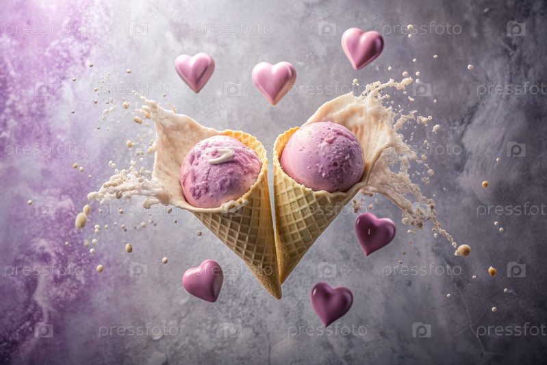 Сладкий десерт. Любовь к мороженому. Сердечно-образный конус мороженого с брызгами, сердцами и пятнами. Концепция Дня святого Валентина. Баннер, реклама