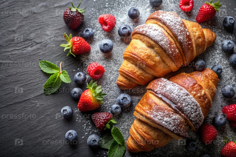 Вкусные свежевыпеченные кроассанты и ягоды на тёмном фоне сланца. французский завтрак. хорошие блинчики для выпечки. пекарня со вкусным хлебом. кондитерские изделия