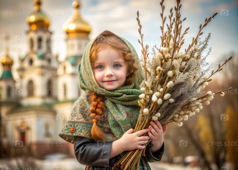 Неделя пальмовых деревьев. христианство. портрет трехлетней девочки в русском народном шале с ветвями ивы в руках на фоне церкви и заката