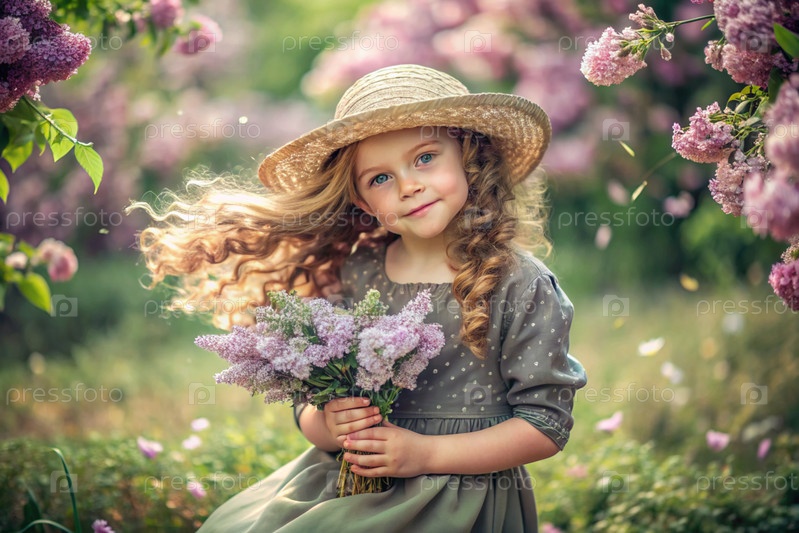 Портрет красивой маленькой кудрявой 4-летней девочки в соломенной шляпе и платье в цветущем лиловом саду. Детство. Ребенок позирует и смотрит на камеру