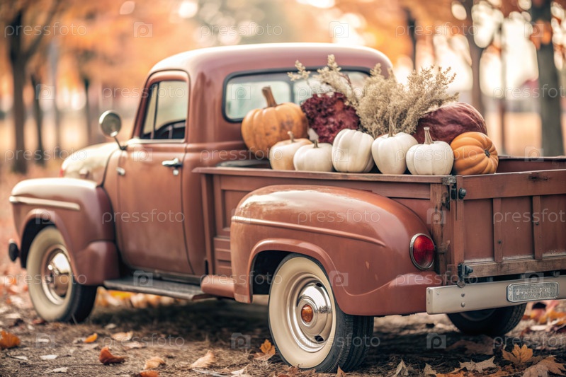 Осень, осенний дизайн.Большой урожай тыквы на заднем сиденье ретро-пикапа, крупный план