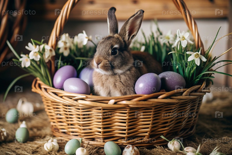 Баннер. пасхальный кролик в корзине из красочных пасхальных яиц вокруг весенних снегопадов и первичной розы. концепция праздника Пасхи