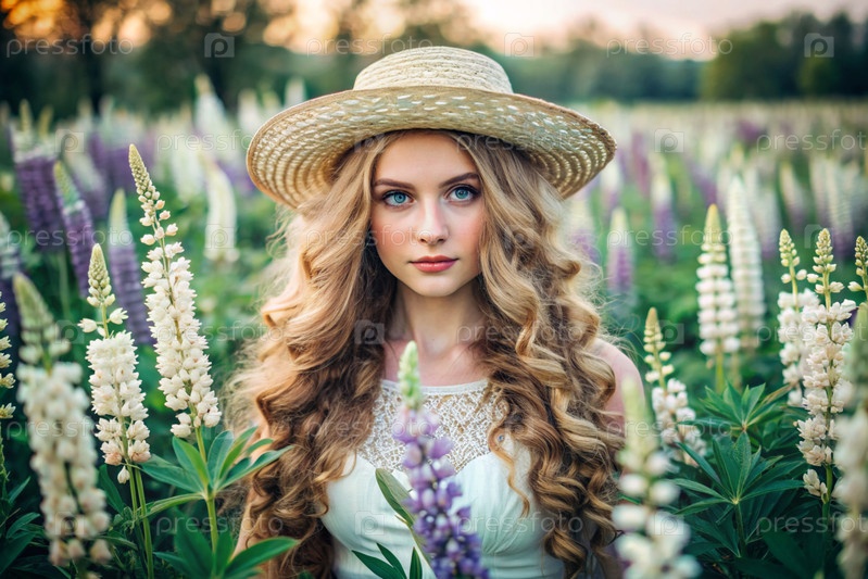 Портрет красивой кудрявой девушки в соломенной шляпе на цветущем поле люпинов.Девушка позирует и смотрит в камеру