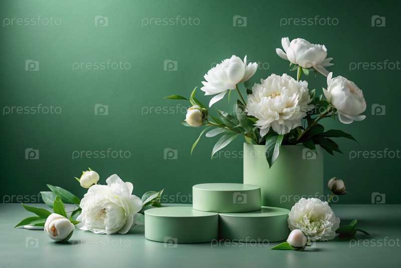 Минимальный изумрудно-пастельный фон для демонстрации продукта.Современный подиум с зеленой стеной и белыми пионками вокруг.Креативный дизайн для презентации продукции