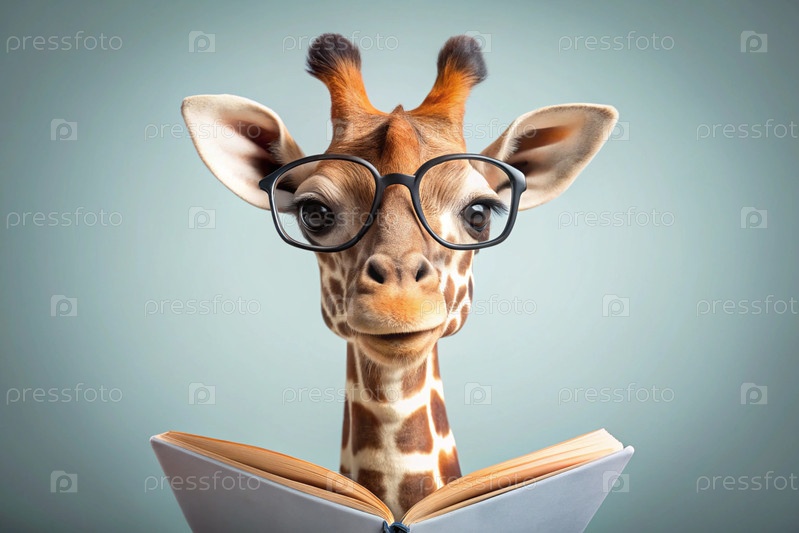 Забавный африканский жираф в очках читает книгу на синем фоне