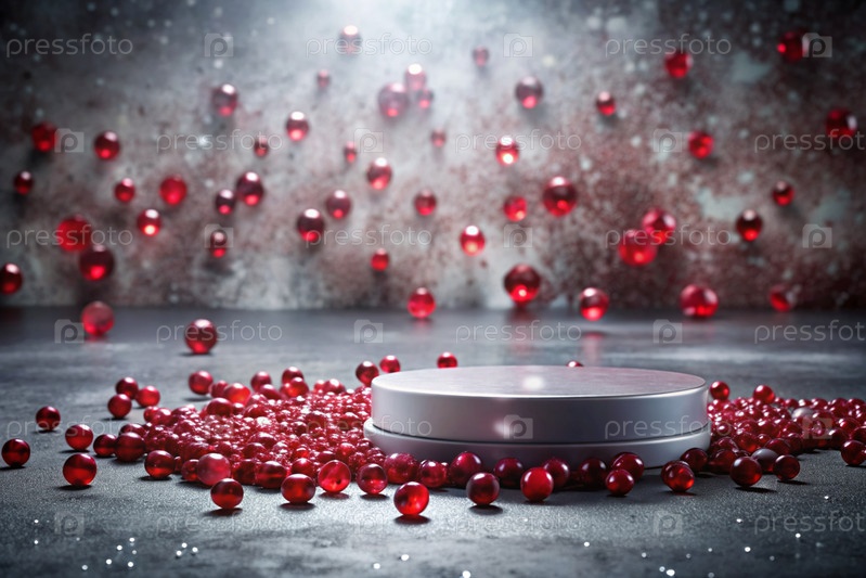 Минималистский фон для выставки ювелирных изделий. Современный пустой подиум с серой стеной и рубинами. Креативный дизайн презентации продукта