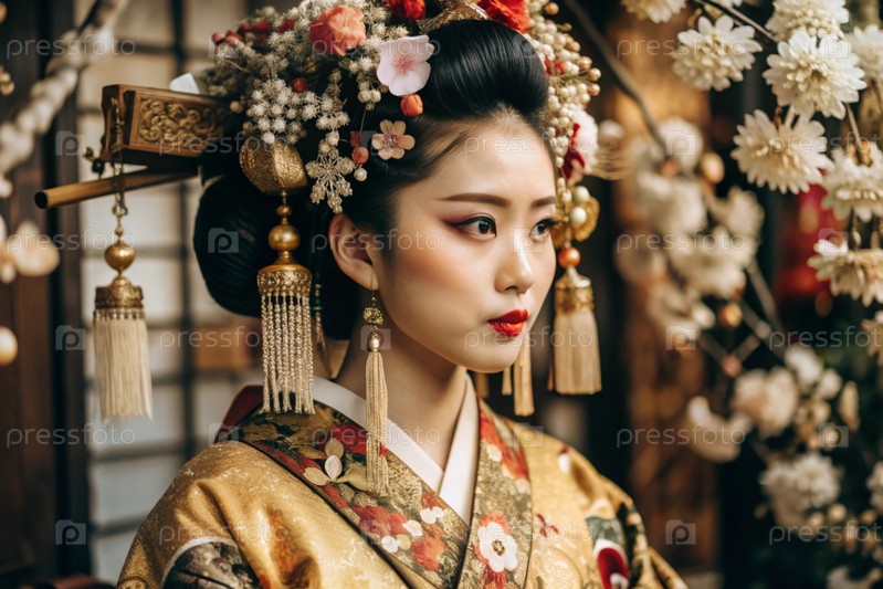 Японская девушка в традиционном национальном костюме - кимоно. На фоне домов, фонарей и вишневых деревьев портрет символизирует традиции и культуру народа Японии