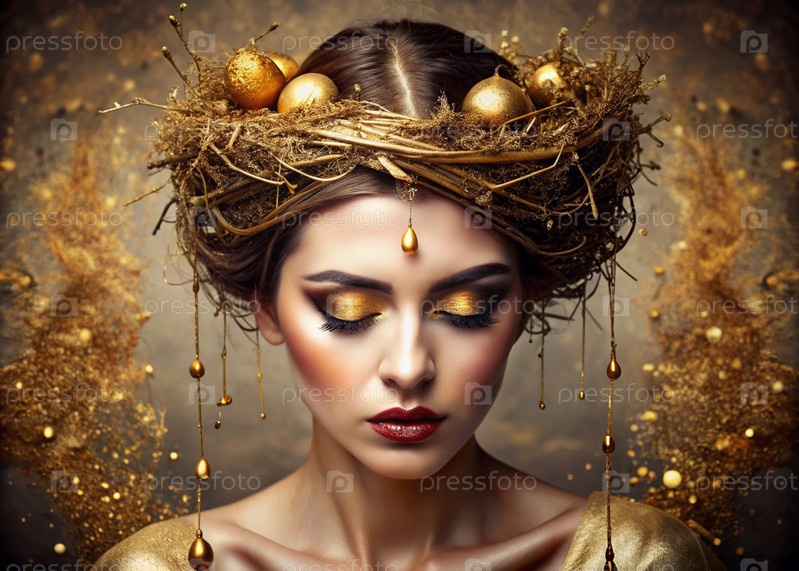 Творческий баннер для салона красоты в черно-золотых тонах. Профессиональный макияжный художник, стилист и парикмахер. Красивая женщина с вечерним гримом и золотым гнездом и яйцами на голове. Индустрия красоты