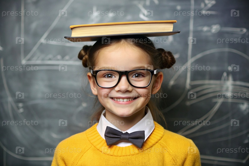 Красивая девушка с очками и книгами на голове. Ребенок впервые идет в школу. Ребёнок в классе со доской на заднем плане. Возвращение к школе