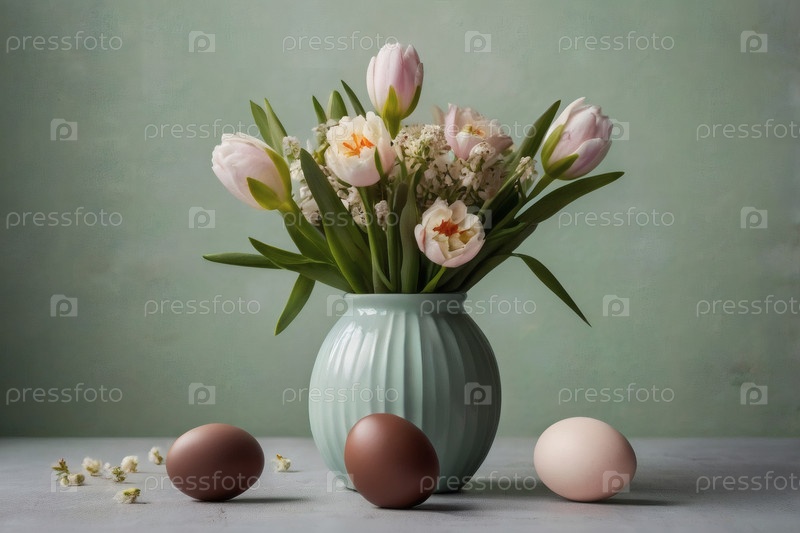 Пасхальные сладости и лакомства. Концепция ярких пасхальных праздников в 2026 году. Хорошая открытка. Баннер. Шоколадные пасхальные яйца, шоколадный кролик и весенние цветы на деревянном фоне