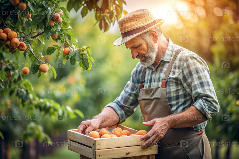 Сельскохозяйственная промышленность. Деревянный ящик с абрикосами в руках фермера-мужчины. Садовник собирает богатый урожай. Ближе, солнечный свет. Осенний урожай фруктов
