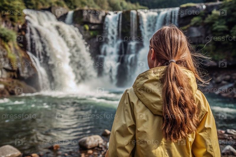 Женщина в резиновом плаще среди огромного голубого водопада. она путешествует и наслаждается жизнью и окружающей средой. туризм