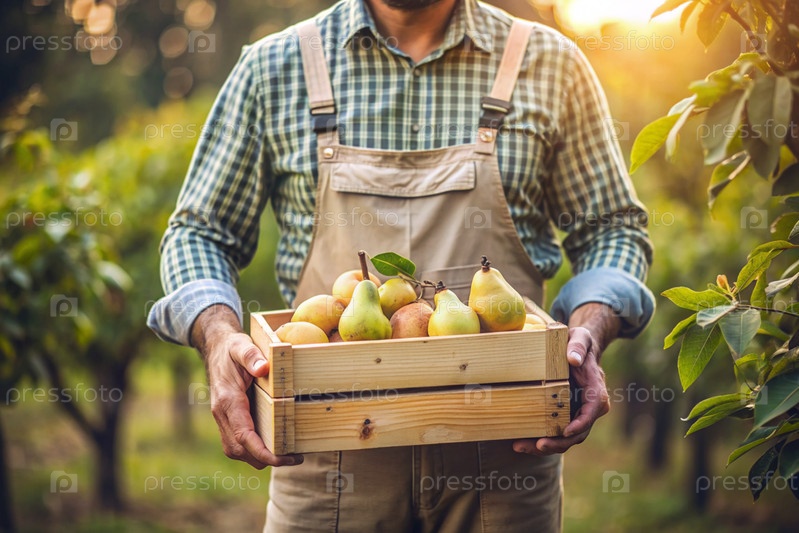 Сельскохозяйственная промышленность. Деревянный ящик с грушами в руках фермера-мужчины. Садовник собирает богатый урожай. Ближе, солнечный свет. Осенний сбор фруктов и овощей